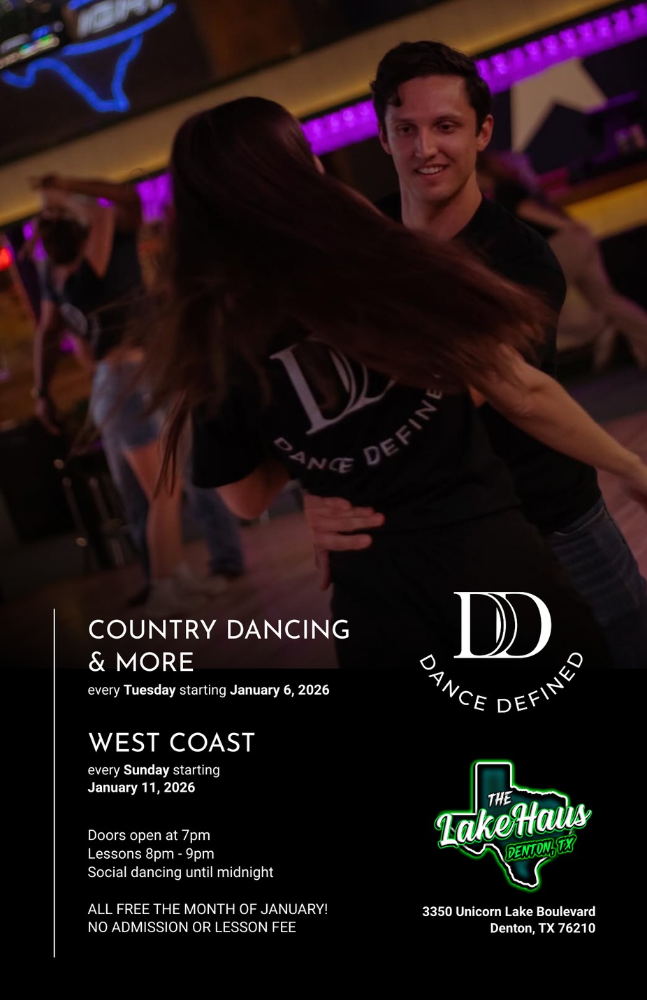 Looking for something fun to do on a Tuesday night? Come dance with us at The LakeHaus in Denton. We’ll be teaching line dancing and country swing, followed by social dancing for everyone. Every Tuesday starting January 6 Doors open at 7PM Lessons from 8–9PM Social dancing until midnight NO ADMISSION FEE ALL JANUARY! Beginner-friendly, welcoming, and a great way to meet people. Whether it’s your first time dancing or you’ve been doing it for years, you’re invited. The LakeHaus 3350 Unicorn Lake Blvd Denton, TX 7621007:00 PM - 12:00 AM
