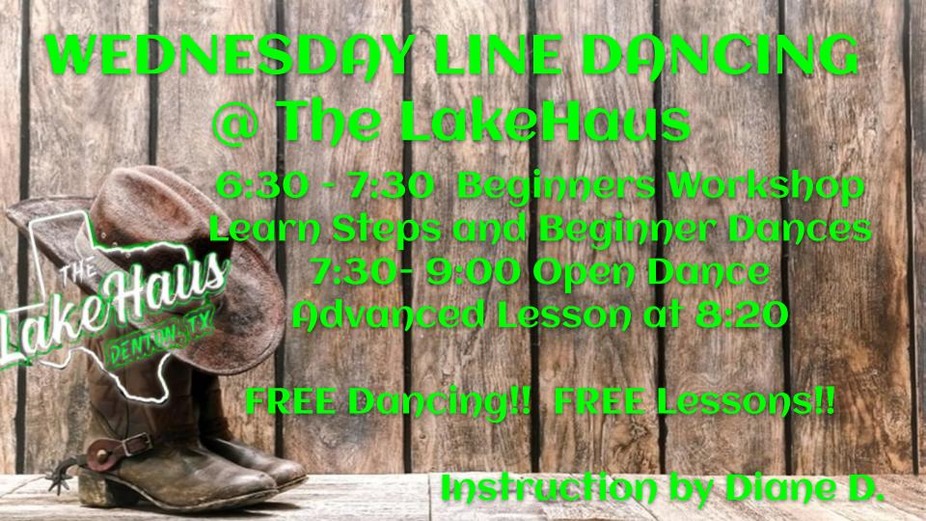 LINE DANCING WEDNESDAYS at The LakeHaus! Free lessons • Free dancing • No partner needed! Boot scoot & boogie with us every Wednesday 6:30–9PM 6:30–7:30 Beginners Workshop 7:30–9 Open Dancing Advanced lesson at 8:15pm Instruction by Diane D. Come early! Grab dinner, snag a good table, and enjoy Happy Hour specials before we hit the dance floor!